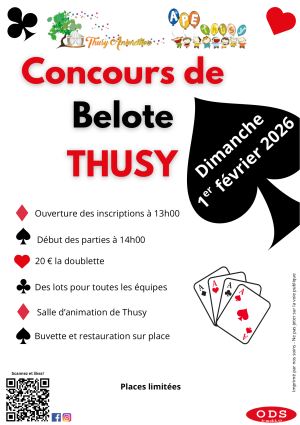 Venez nombreux au concours de belote le dimanche 1er février 2026 à partir de 13h à la salle d’animation !